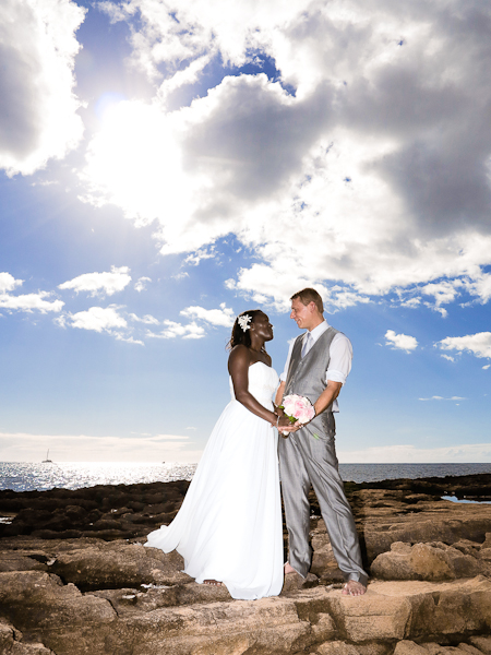 Firstly, she wanted a beach that was secluded. Kahula bay at Ko’olina is a semi-secluded location. Right around sunset, the beach “can” get a little crowded with tourist who are trying to photograph the green flash. Before that, the beach is pretty much empty. Since Chris and Jenny were not looking for sunset pictures, and tying the knot at around 3 pm, the odds of having the beach to ourselves was very high. Her original choice was actually Sherwoods beach. But about two days before the wedding, I recommended that we switch locations as the weather at Sherwoods didn’t look too promising.